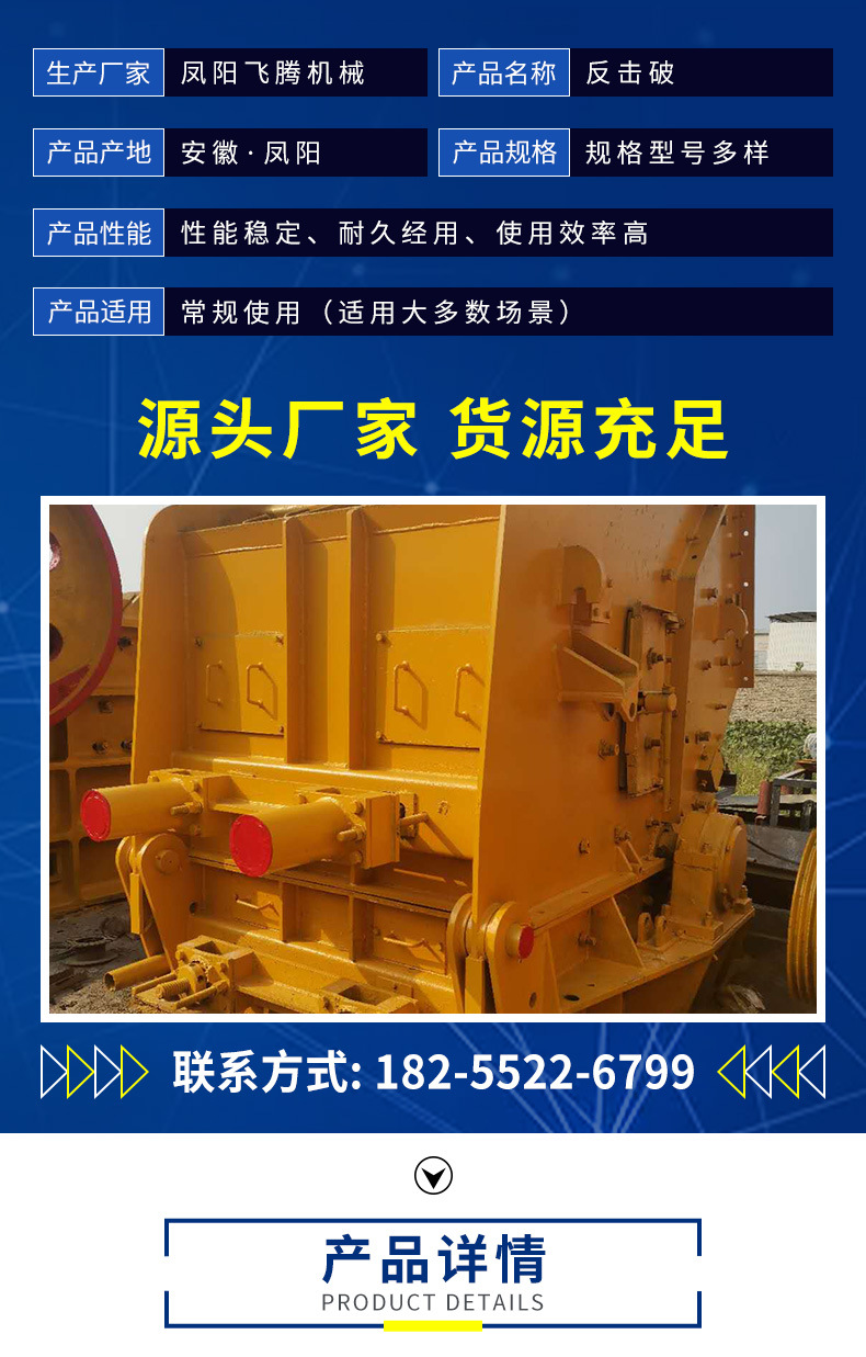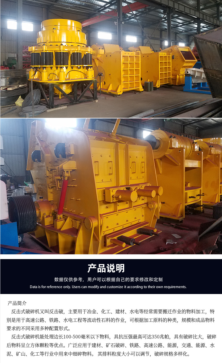 反击式破碎机的设备结构简洁、设备破碎比大、耗能少、产量高、设备轻便、设备产出成品呈立方形体,主要于破碎中等硬度的物料,例如水泥厂的石灰石