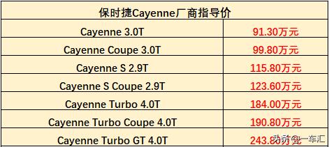 目前国内在售的保时捷Cayenne共有7款车型,售价区间91.30-243.80万元,这里指的仅是基础版厂商指导价,实际成交价格需参考市场终端选装项目而定。全系包含四种动力级别和两种外观类型,(除此之外还有两款2.0T插电混动车型,这里不再详细解读)。其中入门级Cayenne 3.0T车型版扮演着销量主力角色,而这一代新增的Coupe版本,既让Cayenne在定位上变得更时尚,同时也覆盖了更多年轻化消费群体。