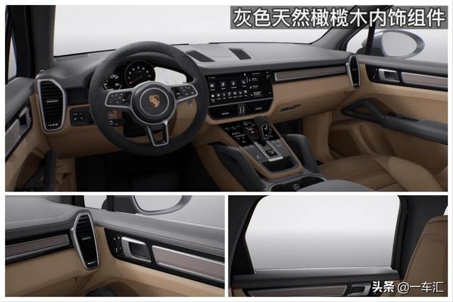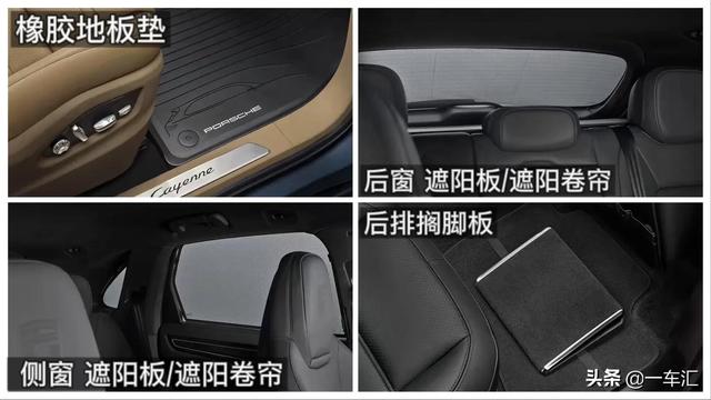 真皮转向柱,价格7300元,转向柱套与内饰同色,并且部分带有装饰缝线的光面真皮部件;与双色调真皮内饰组件搭配提供时,缝线采用饰件的颜色,转向柱套采用仪表板的颜色。中控台扶手上的保时捷盾徽压花,价格3800元,前排中控台扶手带有保时捷盾徽压花。中控台扶手上的车型标志压花,价格3800元,前排中控台扶手带有车型标志压花。座椅头枕上的保时捷盾徽,价格2800元,前排座椅头枕带有保时捷盾徽压花。座椅头枕上的保时捷盾徽,价格5600元,前排和后排外侧座椅头枕带有保时捷盾徽压花。