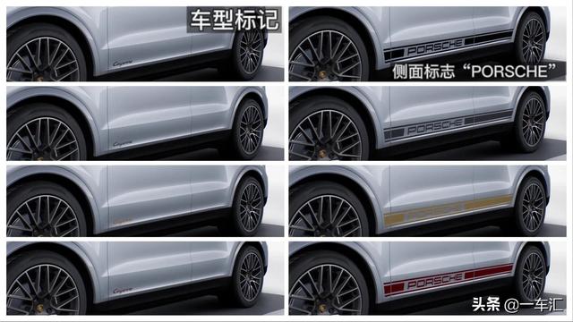 黑色 (高光) 涂漆Cayenne车型标记,价格2900元。涂漆与车身同色的Cayenne车型标记,价格4000元。黑色 (哑光) 涂漆“PORSCHE”标志和黑色 (高光) 涂漆Cayenne车型标记,价格5700元。黑色 (哑光) 涂漆“PORSCHE”标志和黑色 (哑光) 涂漆Cayenne车型标记,价格5700元。黑色 (哑光) 涂漆“PORSCHE”标志和涂漆与车身同色的Cayenne车型标记,价格7800元。去除Cayenne车型标记的黑色 (哑光) 涂漆“PORSCHE”标志,价格3200元。