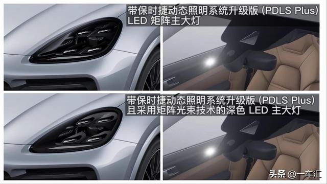 带保时捷动态照明系统升级版 (PDLS Plus) 的 LED 矩阵主大灯,价格24100元,采用矩阵光束技术 (84 像素) 的 LED 主大灯: 基于摄像头的前方车辆和对向来车检测、永久远光灯光柱单段智能变光,反光交通标志分段变光以避免驾驶员眩目。为了优化目标锁定,系统不仅会有选择地变光来使对向来车淡出,还会自动加强光束右侧区域的照明亮度,以便更好地引导驾驶员的视线。附加功能包括:电控弯道灯、包括近光灯在内的 4 点式照明设计、LED 矩阵大灯具备摄像头校准功能、高性能辅助远光灯采用高电流LED灯。