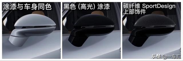 涂漆与车身同色的车外后视镜,选装价格6600元。黑色 (高光) 涂漆车外后视镜,选装价格6600元,包括后视镜基座在内的车外后视镜上部和下部饰件。碳纤维 SportDesign 车外后视镜上部饰件,选装价格18400元,碳纤维车外后视镜上部饰件,下部饰件和后视镜基座为黑色 (高光) 涂漆。