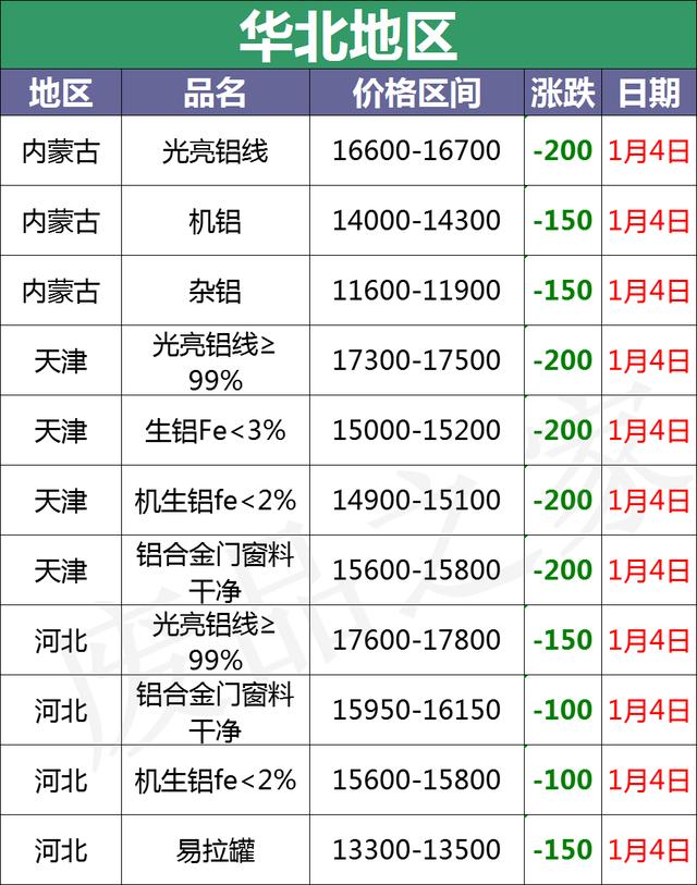 华北地区1月4日起,山西瑞格金属新材料废铝采购价:光亮铝线18000,摩托车轮毂16600,汽车轮毂17500,型材白料16000,型材喷涂料15300,破碎机铝15700,铝模板16100,光亮铜线63600,以上为不含税价。