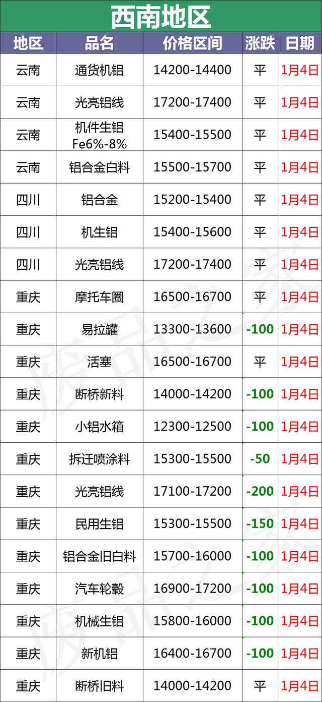 1月4日起,贵州汤巴关回收公司废铝采购价:白铝线16800,普铝线16400,钢芯铝线17800,新清光边料15800,新喷涂边料15200,边料15000-15400,小车钢盆16600,活塞机体15400,生铝13800,锅皮统货11600,小水箱11000,汽车发电机11600,汽车马达10600,铝壳马达7000,摩托车马达6000。