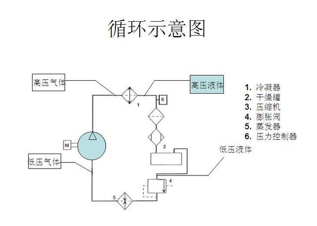1 压缩机② 冷凝器③ 干燥器④ 压力开关⑤ 膨胀阀⑥ 蒸发器