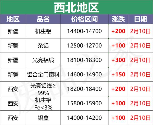 (此处已添加小程序,请到今日头条客户端查看)2月10日起,安徽鹏翔铝业废铝采购价:摩托车汽车油件19400*出水率,生铝边角料18800,大机铝17400,新生铝18500-18800,二级生铝17200,杂生铝16200,生铝水箱15800,小水箱14300,易拉罐15200,压扁易拉罐15500,纯炉盘11900,ADC12铝屑18900*出水率,6系铝屑18400*出水率,纯扣板14700,熟杂铝(铝锅)15900,破碎机铝18000。