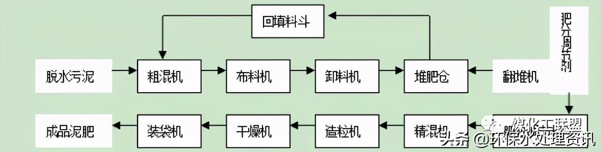 粗混机将脱水污泥和回流堆肥仓出料混合后,经过带式输送布料机和气动侧犁式卸料器进入堆肥仓。在发酵过程中,翻堆机定时对堆料进行翻动,使堆料上下混合均匀,同时将堆料向堆肥仓出口推移。装载机将堆肥仓出料送到回流料斗和造粒料斗,进入回流料斗的物料经输送机进入粗混机,进入造粒料斗的物料则依此经过精混机、造粒机、气流干燥机、装袋机等设备处理,最终制成成品复合肥料。