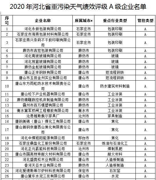 关于2020年河北省重污染天气重点行业绩效评级A、B级和引领性企业名单的公示