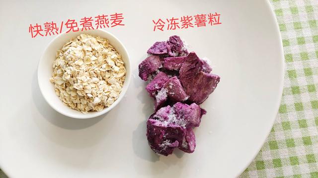 燕麦+紫薯,新鲜的紫薯或者买回来的紫薯切成丁冷冻起来,需要的时候就拿一些出来,这样比较方便。