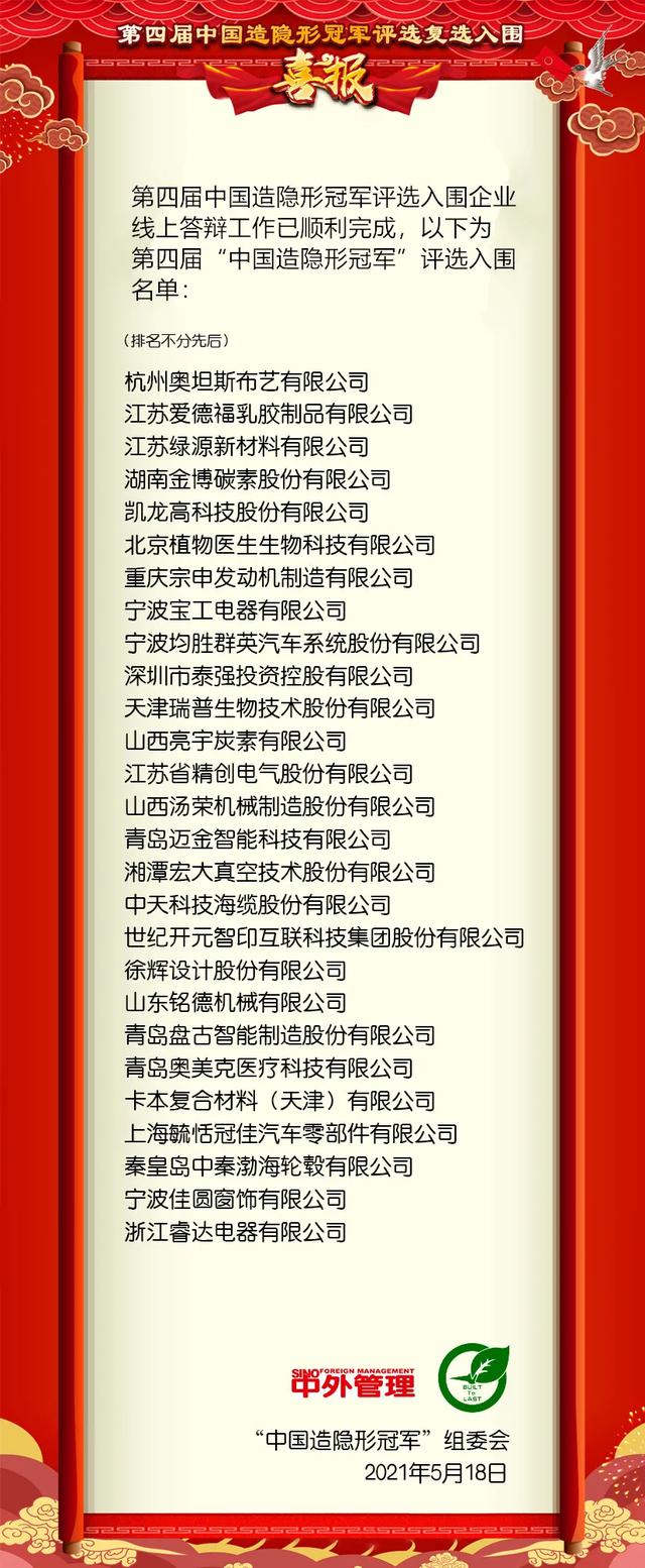 目前,经过诸多龙头链主企业的推荐与组委会初选,第四届中国造隐形冠军评选入围企业线上答辩工作已顺利完成,第四届“中国造隐形冠军”长青峰会预计将于2021年9月9日举办。