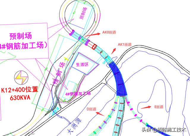 施工安排预制梁场设置于A匝道收费站至喇叭中心位置,因此,互通区A匝道收费站及管理区路基工程需先期开工,提供梁场用地。AK0+926.823匝道桥和AK1+304.296匝道桥(1-6跨)匝道桥为架梁第一通道,将作为武阳互通控制性工程,1号架桥机将由此桥经过D匝道桥进入线路主线开始进行黄山方向铺架施工。计划2020年8月初开始施工桩基,共计31根;2020年9月中旬开始施工墩台,共计21个;2020年11月初开始施工现浇梁,2020年12月底完成箱梁现浇(需三跨支架);4-6跨为钢箱梁,上跨大洲源,需与业主沟通,钢箱梁进场。平面图如下所示。