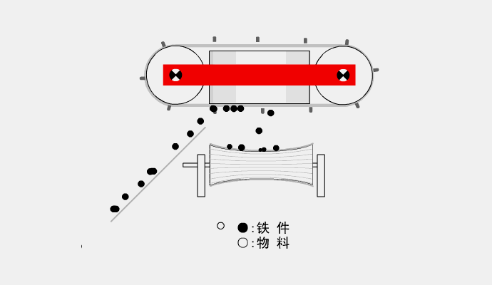当皮带上方所送物料经过带式悬挂除铁器下方时,混杂在物料中的铁磁性物质在强大磁场吸引力的作用下被吸附在弃铁皮带上,被带到磁系边缘,靠铁磁性物质的惯性和重力将其抛落在集铁箱内,从而达到自动连续消除煤流中铁磁性物质的目的。其特点是自动卸铁,维护简便,良好的防尘、防潮和防腐蚀能力。