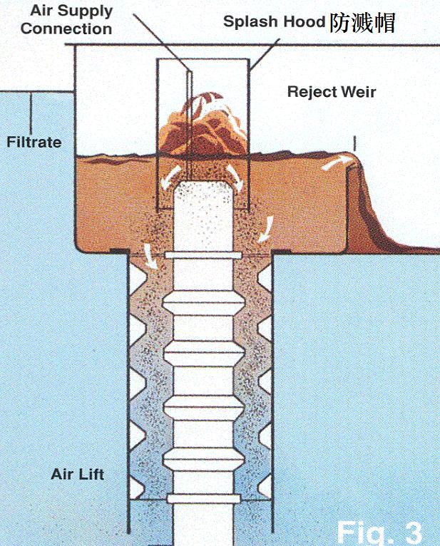 ■ 位于过滤装置中央的空气提升泵,将底层截留大量污染物杂质的石英砂滤料,提升至过滤装置顶部的洗砂器中