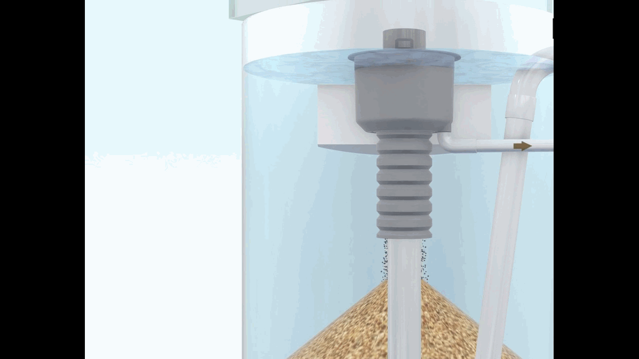 ■ 清洗后的净砂经防溅帽导流后,落入洗砂波纹管,利用自重返回到砂床顶部,重新参与过滤。