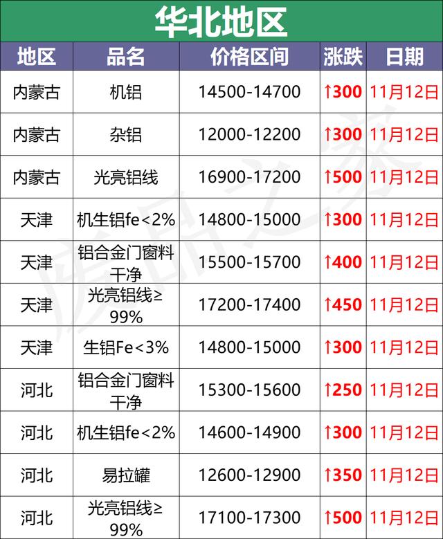 11月12日起,广东东莞东城温塘华拓再生资源废铝采购价:带钉合金14200-14500,拆铁14800-15200,散易拉罐13000,压块12800,天花杂铝11500,亮线16500-16800,61硬合金15000-15300,新料15800-16300。