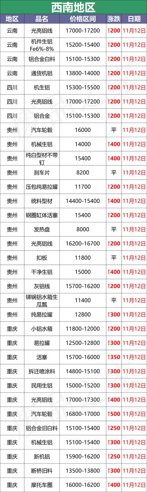 西南地区11月12日起,重庆新格集团废铝采购价:棉花包易拉罐13450,压扁易拉罐14050,另纯扣板、吊顶板、铝塑板、1系、3系、5系边角料,看货议价,以上价格针对重庆、巩义、滨州三个场地不含税到厂价。