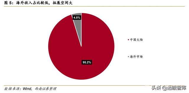 公司营业收入主要来源于中国大陆,2020年国内营收为31.7亿元,占比高达 95.2%,海外市场营收仅1.6亿元,占比4.8%。