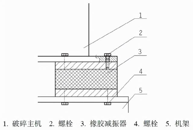 下面简单分析一下破碎机的几种安装形式,并比较它们的优缺点。1 刚性连接1.1 连接方式如图1所示,破碎主机与机架采用螺栓螺母连接,破碎主机与机架之间无缓冲减振装置。由于螺栓的弹性模量大,变形小,这种方案被认为是刚性连接。