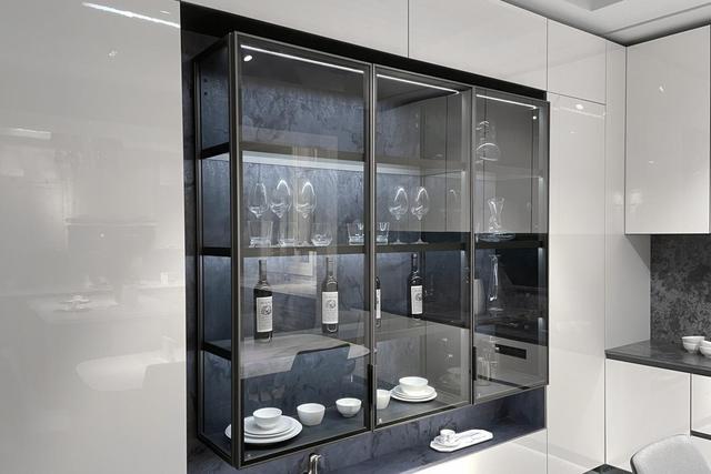 玻璃展柜的设计,【穆萨】系列选择了悬挂式,使用暗夜星云背景板,与高光白形成强烈视觉明暗对比,层板灯光点缀其间,更显通透灵动质感。让厨房日常储物,既轻而易举又赏心悦目,储存的红酒可以拿出来摆上了,小心脏瞬间被俘获了。