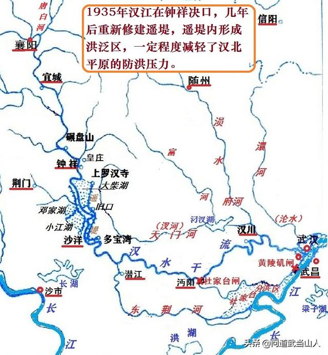 最严重的是1935年7月7日,钟祥汉堤在洪水冲击下全线崩溃,河水一泻千里。由于汉江多处改道,泥沙淤积二十多里,导致汉堤无法修复而被废,之后钟祥出让200多平方公里洪水之后的沙地和沼泽,作为洪泛区,在区域外新建了遥堤。