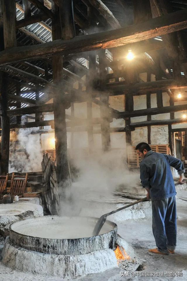 自贡燊海井,昏暗的制盐房内正在古法制盐。
