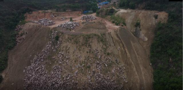 原本青翠的山林被“开膛破肚”,劈山采石作业面落差近百米如一面高墙,废土废石随意丢弃掩埋大量树木植被……