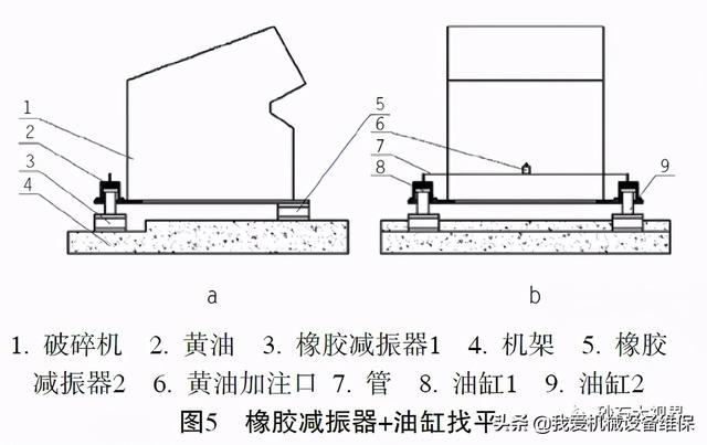 如图5所示,油缸8、油缸9的缸筒与破碎机连接,油缸活塞杆与减振器3上侧钢板连接,减振器3和减振器5下侧钢板与机架4连接,减振器5上侧钢板与破碎机1连接,油缸8和油缸9的无杆腔通过油管7联通,两油缸无杆腔内通过黄油加注口6加注黄油,因为两腔联通,因此两无杆腔压力始终相等。