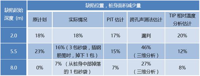 清晰的探测到所有钢筋笼内的缺陷(或异常),分别位于桩顶以下5.5m、8.0m与桩底。不能发现钢筋笼外的缺陷。采用3根声测管,不能精确估计缺陷尺寸,本案例中缺陷被明显夸大、高估了。TIP测试分析