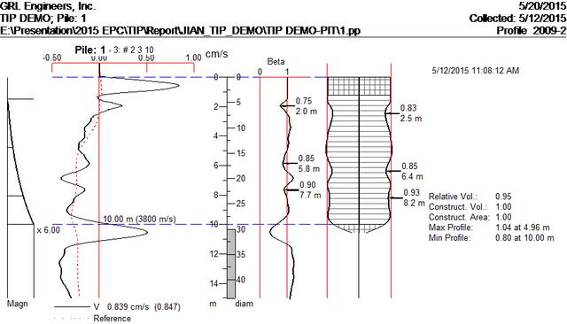 如果只是想看到桩底,没有必要对该信号进行指数放大。然而,为分析桩身中、下部缺陷的尺寸,需使用指数放大系数MA=6(考虑桩阻尼与土阻力),使桩底反射信号幅值与入射脉冲幅值相等。选择几个记录进行平均。在profile analysis侧剖面分析界面中,使用起跳点—起跳点方法(rise to rise)显示时间。设定WS = 3800 m/s 。下图中红色的点划线,反映了土阻力的影响.经初步分析,可以发现3处缺陷(见下图)。侧剖面分析的结果: