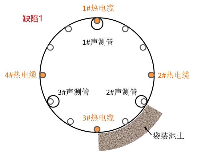 缺陷1:桩顶以下2.0~2.5m范围,钢筋笼外侧捆绑3袋泥土,模拟钢筋笼外夹泥,覆盖不好。位于2#和3#声测管之间。