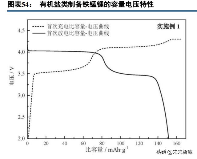 公开于 2016 年的专利 CN105244497A 描述了以硝酸锰、硝酸铁、磷酸为原料液相法制备磷酸铁锰中间体, 再和锂源复合煅烧获得磷酸铁锰锂的方法。实施例的铁锰比为约 2:8,掺杂少量镍源和镁源,关键沉淀反应的有 机助剂为乙醇。所得磷酸铁锰锂在 0.2C 下容量超过 150mAh/g,1C 下超过 140mAh/g,5C 下约 130mAh/g(但 电压平台出现了相当程度的降低)。研究工作还进行了低温性能测试,-20 度、0.2C 条件下容量仍保持在 100mAh/g 以上,估计全电池的能量密度保持率可以达到 50%。