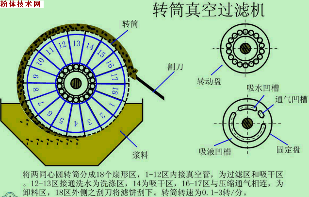 工作原理:盘内部沿径向分割成若干扇形格,每格均有单独孔道通向分配头。当盘转动时,凭借分配头的作用使这些孔道依次与真空管及压缩空气相通,故盘在回转一周的过程中每个扇格可按顺序进行过滤、脱水、吹松、卸料等操作。