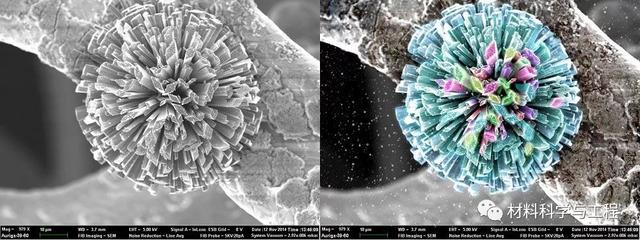 【5北京科技大学-吴海林】花中玫瑰/百花争鸣:当这些“花”绽放时,味道并不是那么芳香四溢,相反,而是那种臭气熏天,到底有多臭,想都不要想,会受伤的;为了下一步操作,我也不得不带上防毒面具;实际上这是VS2纳米材料的微观尺度图像;相对于一维和二维结构,这种三维结构的纳米花在一定程度上增大了比表面积,能有效的负载一些活性物质,且这种材料导电性能好,具有半导体的性质,有望在光催化、超级电容器和电池产业等绿色能源上发挥重要的作用。设备:SEM电镜。