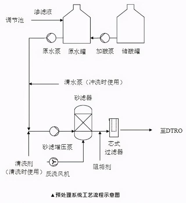 高浓度废水由于其出厂条件、前处理流程等的不同,其组成成份复杂,存在各种钙、镁、钡、硅等种难溶盐,这些难溶无机盐进入反渗透系统后被高倍浓缩,当其浓度超过该条件下的溶解度时将会在膜表面产生结垢现象,而调节原水能有效防止碳酸盐类无机盐的结垢,故在进入反渗透前须对原水进行pH值调节。