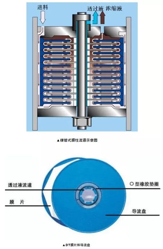 碟管式膜组件具有专利的流道设计形式,采用开放式流道,料液通过入口进入压力容器中,从导流盘与外壳之间的通道流到组件的另一端,在另一端法兰处,料液通过8个通道进入导流盘中,被处理的液体以最短的距离快速流经过滤膜,然后180°逆转到另一膜面,再从导流盘中心的槽口流入到下个导流盘,从而在膜表面形成由导流盘圆周到圆中心,再到圆周,再到圆中心的双”S”形路线,浓缩液最后从进料端法兰处流出。