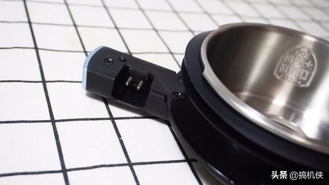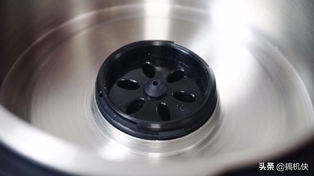 五金杯盖内外层采用食品级304不锈钢制造,衔接位置带有杯盖密封圈,使用前淋水有助于旋合,这个小秘密只有用过破壁机的用户才会知道。杯盖把手延长出65mm,并贴附有注意事项。背面带有两个供电柱和一个小卡扣,和搅拌杯扣紧时,能听到“嘀”的一声,杯盖造型整体看起来有点像高压锅盖。