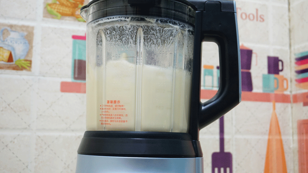 伴随着低转速搅拌,将黄豆切割打碎,同时刀盘在不断加热。直到温度到达100℃,刀盘加快转速,将大颗粒黄豆切割粉碎。继续切换转动搅拌的同时,搅拌杯内持续加热。充分煮熟的黄豆,口感会更好,更能够保留黄豆纯粹的豆味。持续工作了三十四分钟之后,破壁机停止运行,几声“嘀嘀嘀”提示声响。