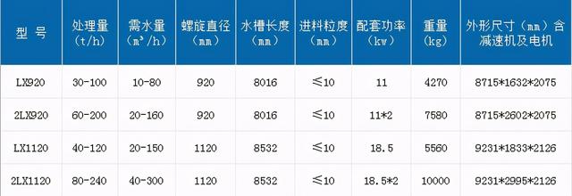 螺旋式洗砂设备一小时可以处理的物料的量为15-260t/h,设备的规格型号有: