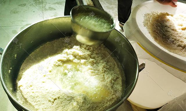 1、将糯米倒入雅大蒸煮摊凉酿酒设备中浸泡4小时左右。用手捏米粒,一搓即成灰,为恰到好处。