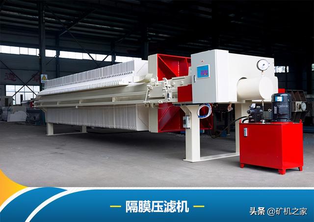 隔膜压滤机的滤板是双面隔膜型腔。隔膜滤板与外形相同的滤板间隔排列形成一个个一定容积的滤室,是依靠压紧装置将滤板压紧,再将悬浮液用泵压入滤室,向隔膜型腔内注入一定压力的气体使隔膜鼓起来反向对滤饼旋压,以达到降低滤饼含水率目的。通过滤布来达到将固体颗粒和液体分离。