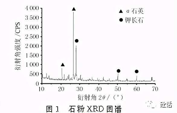 5)石粉。上述自产花岗岩机制砂经球磨机磨细制得的花岗岩石粉,比表面积为327.5m2/kg。石粉的XRd图谱见图1。由图1可知,石粉主要矿物相为石英和钾长石。