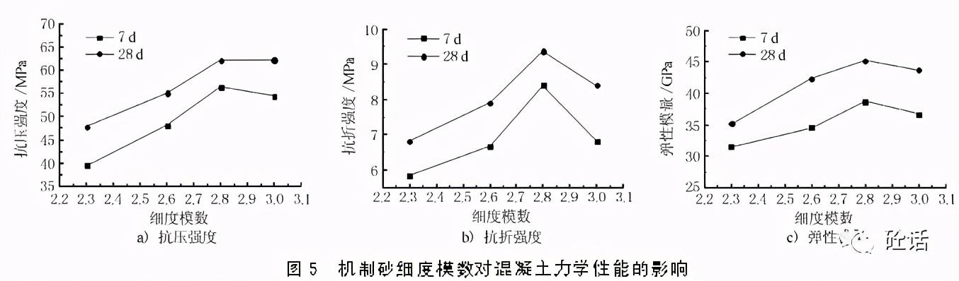 图5为机制砂细度模数对混凝土抗压、抗折强度和弹性模量的影响。