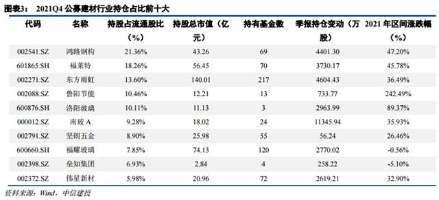 根据中信建投的数据,2021年四季度,共有 43 家建材个股进入公募前十大持仓名单,持股集中在细分行业龙头。
