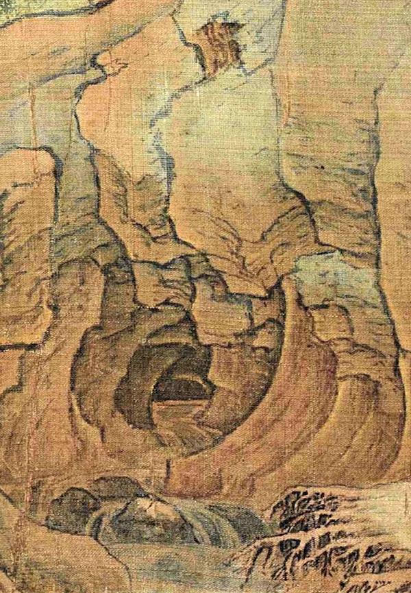 王希孟《千里江山图》其实可以分为四段,通过水面隔开的。第二段中间也有水隔开但看到有桥,可以视为一个整体的段落。“千里江山图”尽管很长,其实就分四段,这四段中,最高峰就出现在“紫府”处,其他三个段落有芙蓉、蓬莱、瑶池、瀛洲、方丈等诸岛,四段结构就是这样的。就是这么简单的一个结构。再看“千里江山图”的洞,也很多,草庐建在洞前边,这边还有一个水帘洞。洞就是连接“紫府”与其它诸仙岛的通道。