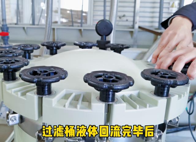 3、过滤桶内的液体通过出口管路回流到槽子里面,等到液体回流完毕之后,打开过滤机上盖。