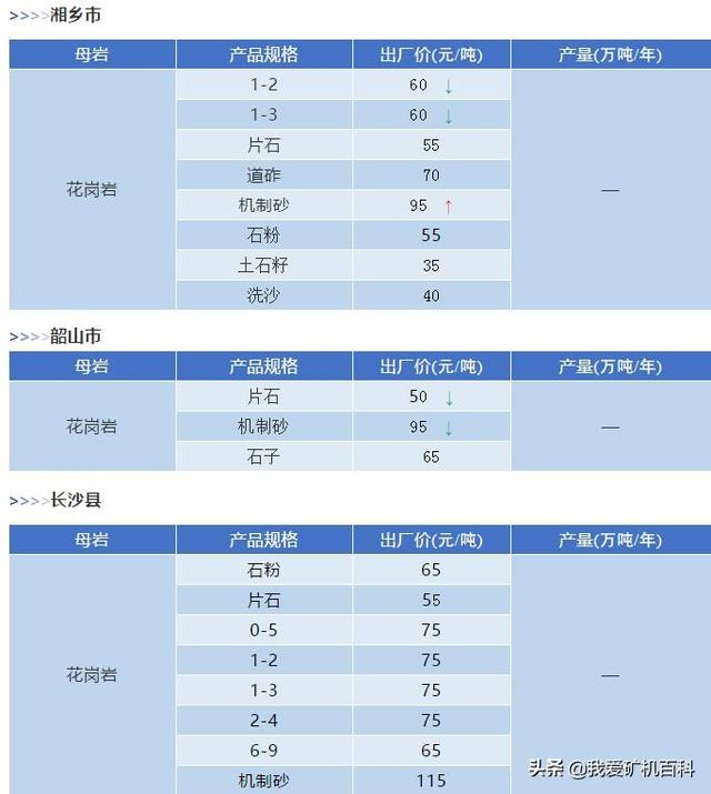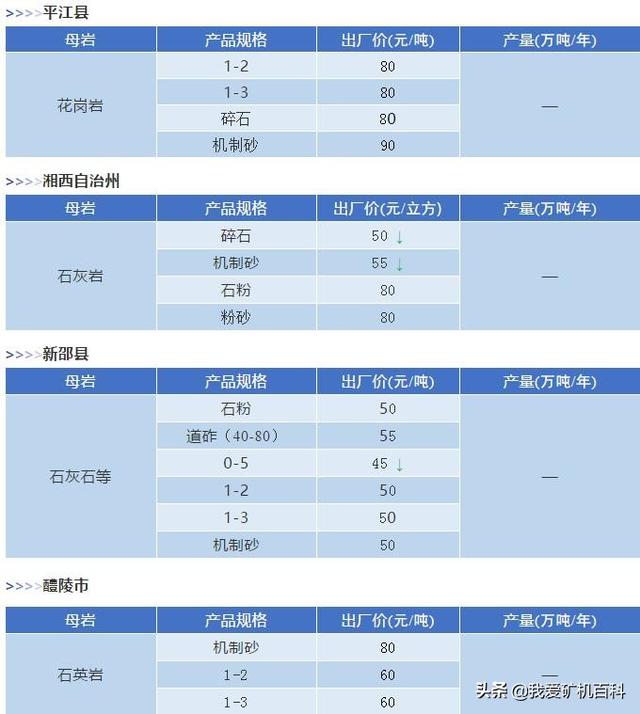 ◆ 湖南区域双峰、湘乡、韶山、湘西、长沙、郴州、衡山等地砂石价格均有不同幅度下降,其中长沙降幅明显。机制砂85元/吨、黄砂140元/吨,最大降幅达17.5%。