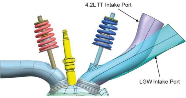 缸内燃烧的部分,单缸模型可以节省研发成本、借鉴在这款V8之前已经量产的双涡轮V6机型(代号LGW,也是CT6用的机型,并且我们国内上市的第一代CT6有这款发动机配置,尾标为“40T”,LGW V6TT双涡轮增压发动机的动力性表现在国内得到车主们惊艳的认可)。但是由于这款V8用的“热V”结构,也就是刚说的整个发动机排气结构都在缸体缸盖的V型结构中间,需要缩短气缸中的排气管路给其让空间。那进气管道走向就需要创新,以便能连接与LGW V6TT不同的进气歧管。