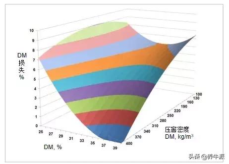 如上一篇文章所述(建立玉米青贮DM动态变化的全局观),若压窖密度不够,则青贮内部气体比例会有所增加,青贮的干物质损失就会增加,一般需控制在5%-10%以内,干物质损失与压窖密度的关系如图8所示。