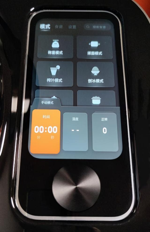 操控区域内,上面是圈厨智能多功能料理机操作屏幕,7吋 IPS全触控屏幕,菜谱都是视频菜谱,而且还带语音引导功能,简直是贴心到不行。屏幕下方是旋转式开关,可以调整时间,温度,转速等;短按旋钮是开始烹饪,烹饪暂停等;长按旋钮就可以关机了。