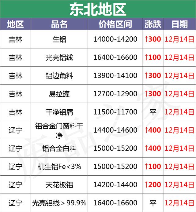 最新12月14日全国铝业厂家收购价东北地区12月14日起滨州进口木材破碎机采购,吉林长春鼎盛祥物资废铝收货价:白铝板15700滨州进口木材破碎机采购,灰铝板15600,铝水箱11400,大铝水箱12500,熟铝12900,,活塞16200,摩托车圈(带铁扣铁)16200,摩托车圈(不带铁)15900,生铝通货14200...